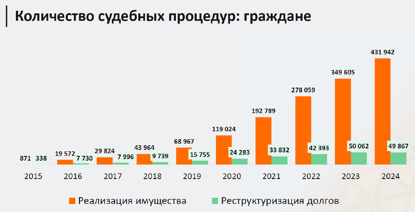 Согласно опубликованному отчёту, общее число граждан, признанных банкротами, продолжает расти. Если в 2023 году их было 350 тысяч, то в 2024 году стало 432 тысячи человек – то есть на 23,6% больше. В общей сложности с момента введения в практику судебного банкротства физлиц его прошли уже больше 1,5 миллиона должников.